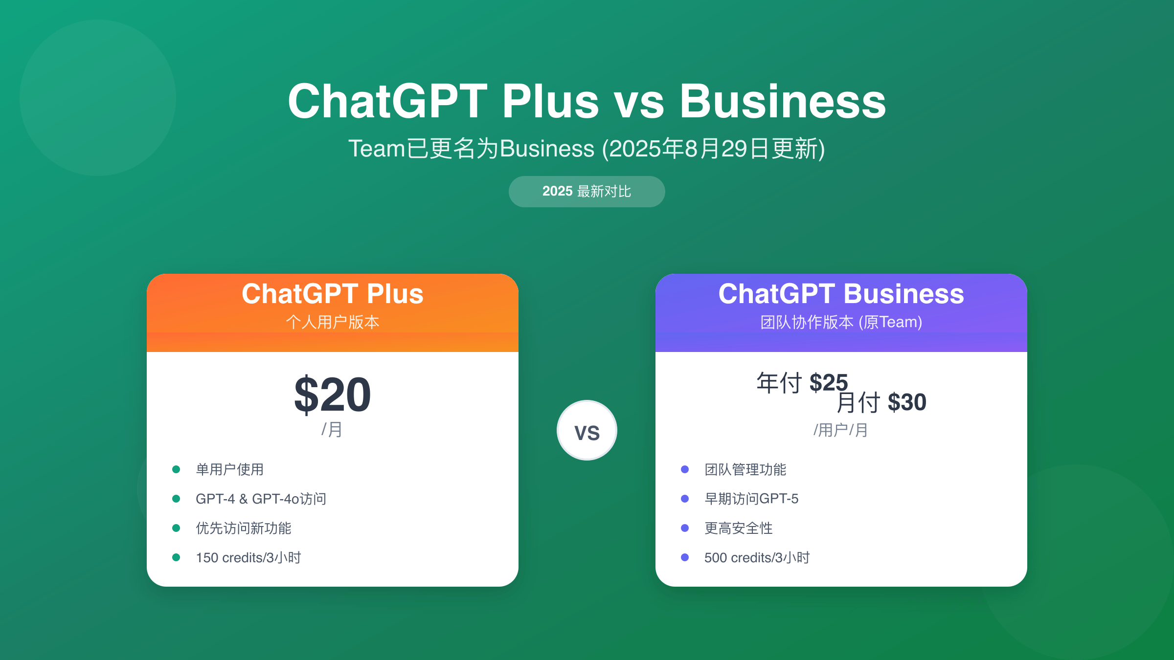 ChatGPT Plus月费$20适合个人用户,ChatGPT Business月费$25-30适合2人以上团队。主要区别在于消息限制(Plus 40条vs Business 100条/3小时)、团队协作功能和数据训练排除政策。Business原名Team,于2025年8月29日正式更名。
