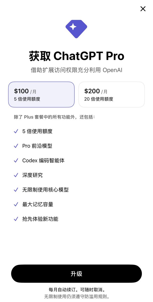 OpenAI 最新推出 100 美金/月的 Pro 套餐,默认比 Plus 在 Codex 用量上多 5 倍。